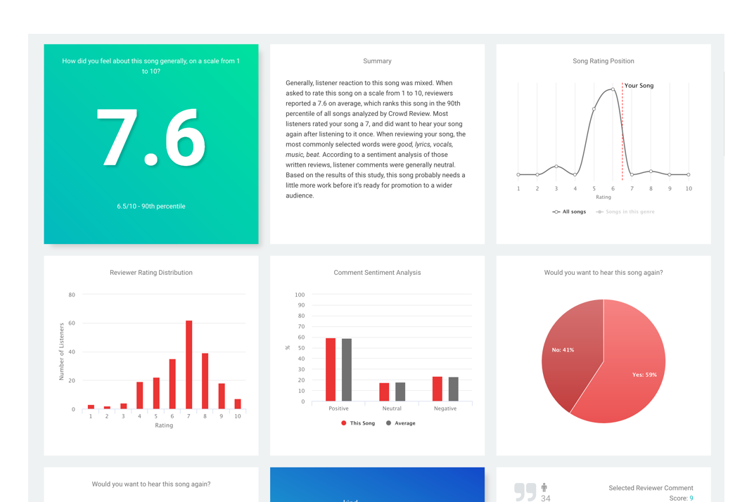 Since then, ReverbNation has incorporated Audiokite's technology into its revamped Crowd Review. Now, you can customize your research report in the areas most important to you with brand new Advanced Insights like Songwriting Analysis, Production Quality, Audience Identification, and Commercial Potential.